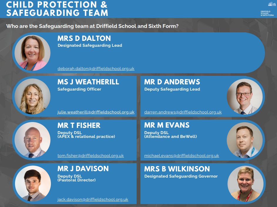 All staff at Driffield School and Sixth form receive up to date training annually to ensure they are fully aware of any emerging issues locally and nationally, as well as being fully aware of all policies and procedures. Although keeping children safe is the responsibility of every member of staff in school, we do have a core team that are able to take a lead with specific child protection concerns.
